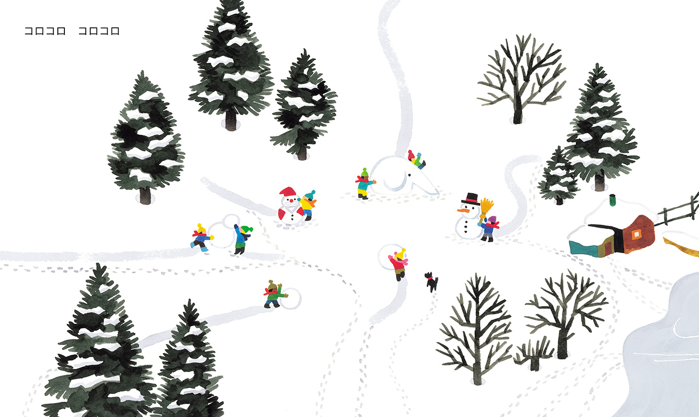 雪がつもった山のなか、動物たちの足跡が見えてきました。 しずかな白銀の世界に、雪遊びをする子どもたちの歓声が聞こえてきます。 村のにぎわいを通りすぎると、川をこえたところに一軒の家。 その家の人は、村の子どもたちに見送られて空へ——。